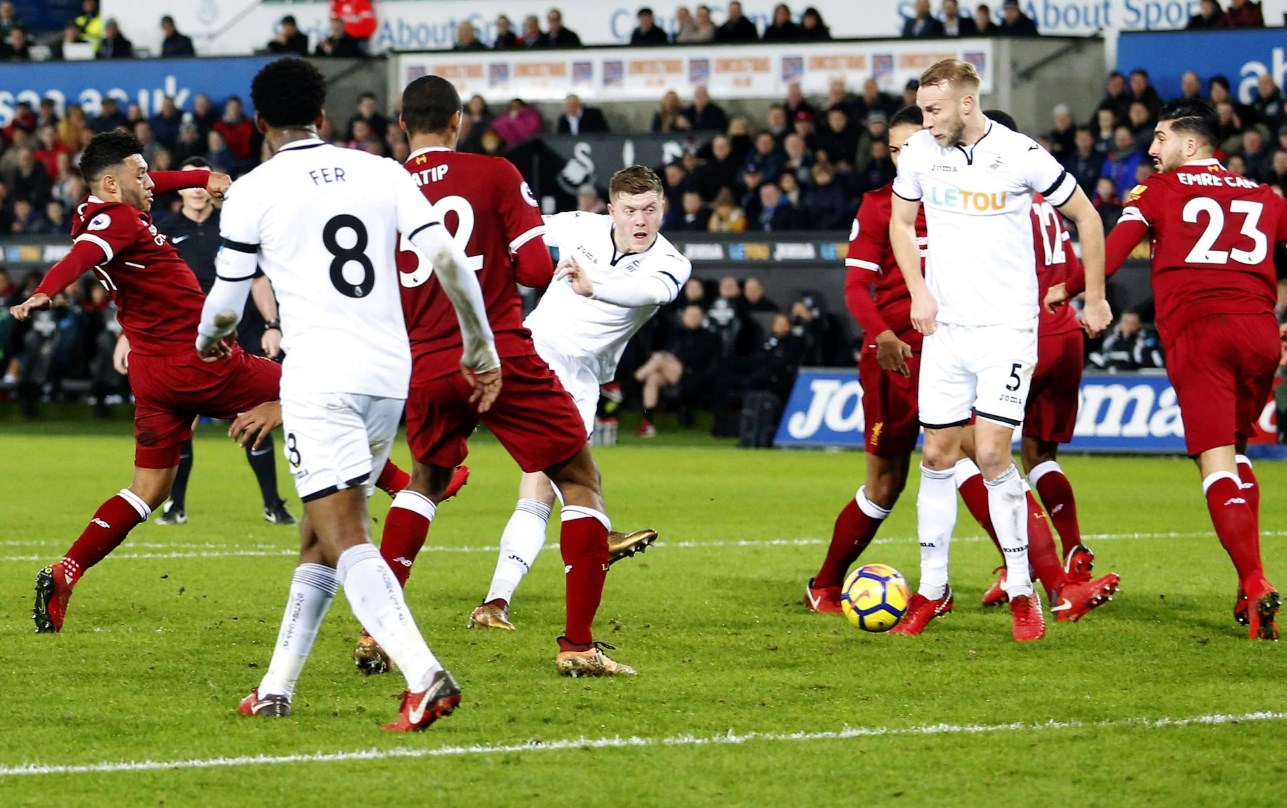 Pada menit ke 40 Alfie Mawson mencetak gol kemenangan untuk klub papan bawah Swansea saat melawan tim papan atas Liverpool.